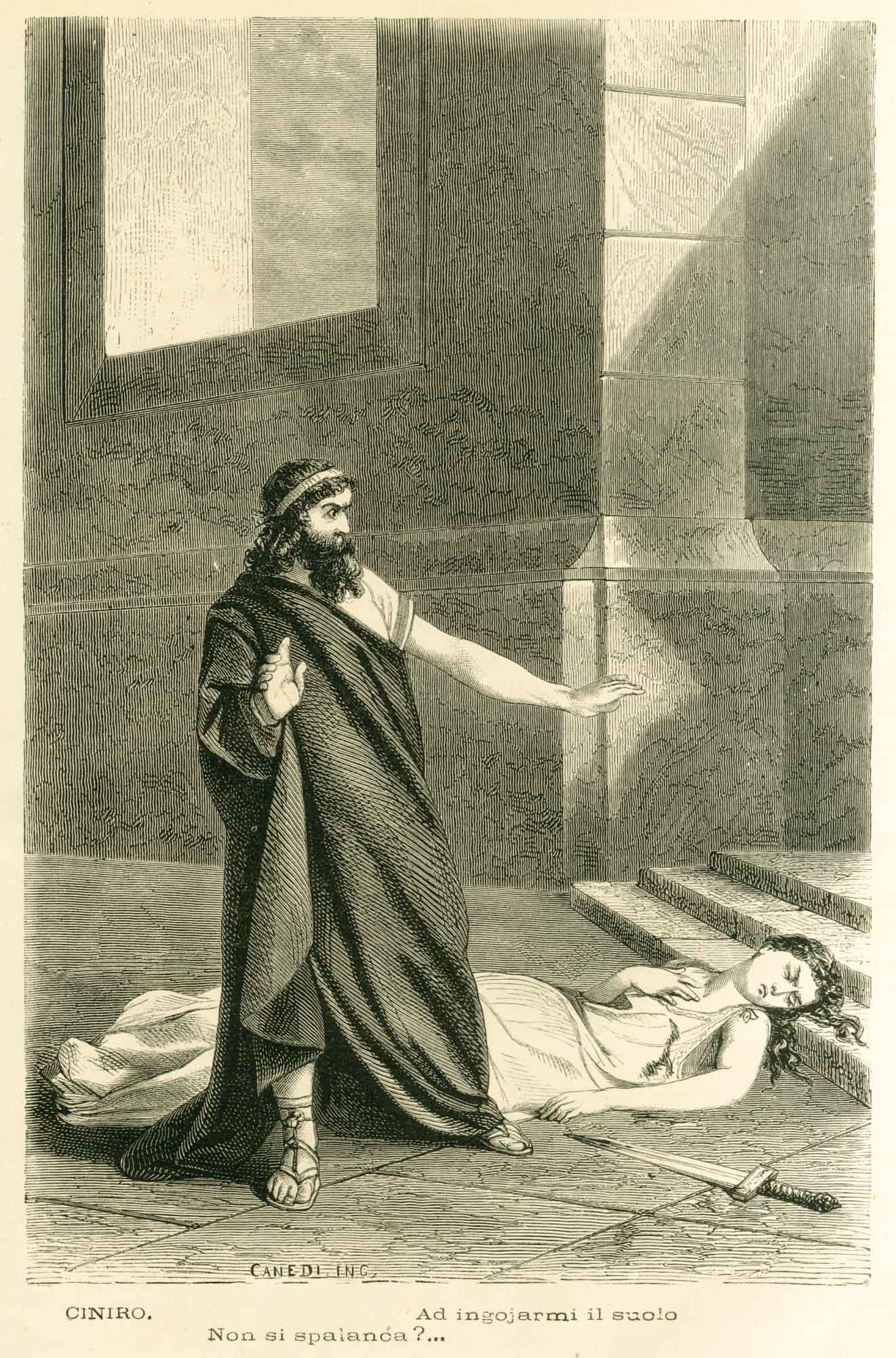 Ideata nell’ottobre 1784 e stesa in prosa nel dicembre del 1785, fu versificata nell’estate successiva. Il mito è tratto dal libro X delle Metamorfosi di Ovidio, ove si narrava della passione della protagonista per il padre Ciniro. Tuttavia la trama alfieriana presenta − rispetto al modello del poeta latino − una forte originalità, dando luogo a un dramma psicologico della reticenza e del “non detto”