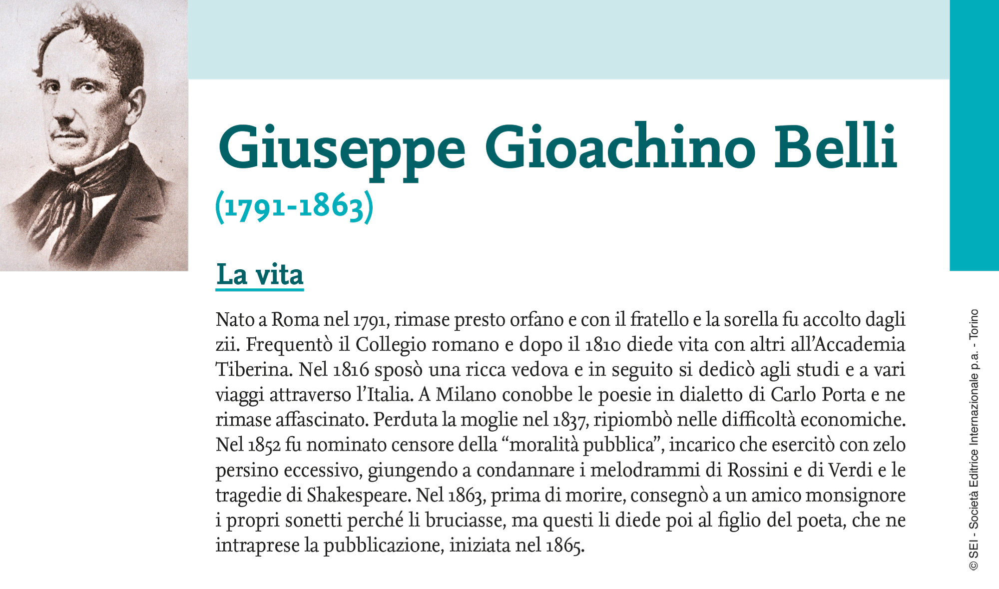 La produzione poetica di Giuseppe Gioachino Belli c’è una scelta simile a quella di Carlo Porta: l’uso del dialetto, il tono realistico e popolare e l’attenzione alle classi più povere. Tuttavia, mentre il milanese è parlato (e scritto) dall’intera società lombarda, nel contesto romano il dialetto è usato solo dai ceti popolari e le opere di Belli, anche per la loro componente di critica sociale, vengono accolte con diffidenza. I suoi Sonetti in romanesco (ben 2279) furono composti lungo un arco di tempo che va dal 1819 al 1847, ma rimasero clandestini durante la vita dell’autore e furono pubblicati solo in parte con i tagli operati dalla censura nel 1865. Nell’Introduzione alla sua opera, scritta nel 1831, il poeta sottolinea la scelta dell’attualità storica e l’attenzione per le condizioni di vita dei ceti più poveri rappresentate con accurato realismo. Per questi, l’esistenza è precarietà e la sola certezza è la morte; mentre le persone di potere si contraddistinguono per l’ingozzarsi e il rimpinzarsi, il «maggnà»: il mondo si divide tra quelli che magneno» e quelli che «nun magneno». Bersaglio polemico della poesia di Belli sono coloro che esercitano il potere, soprattutto il papa e il clero.