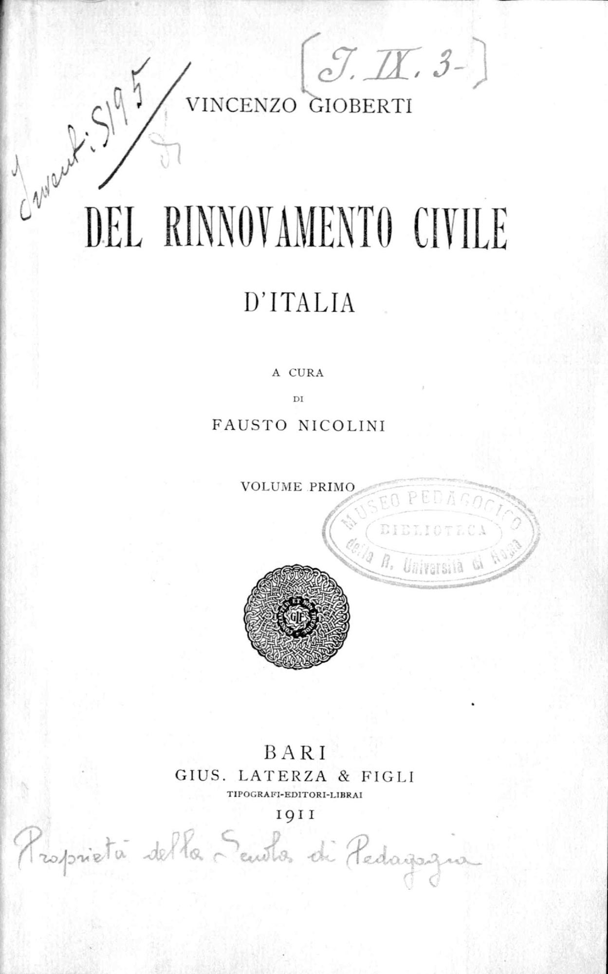 Il torinese Vincenzo Gioberti (1801-1852) partecipò attivamente alle vicende del Risorgimento. Ordinato sacerdote nel 1825, fu cappellano alla corte di Carlo Alberto, ma si avvicinò a posizioni repubblicane e mazziniane sino a collaborare con la rivista «La Giovane Italia». Arrestato nel 1833 e costretto a un lungo esilio a Parigi e a Bruxelles, rientrò a Torino nel 1848, dove fu ministro della Pubblica Istruzione e capo di governo, e infine nominato ambasciatore a Parigi, ove morì.
