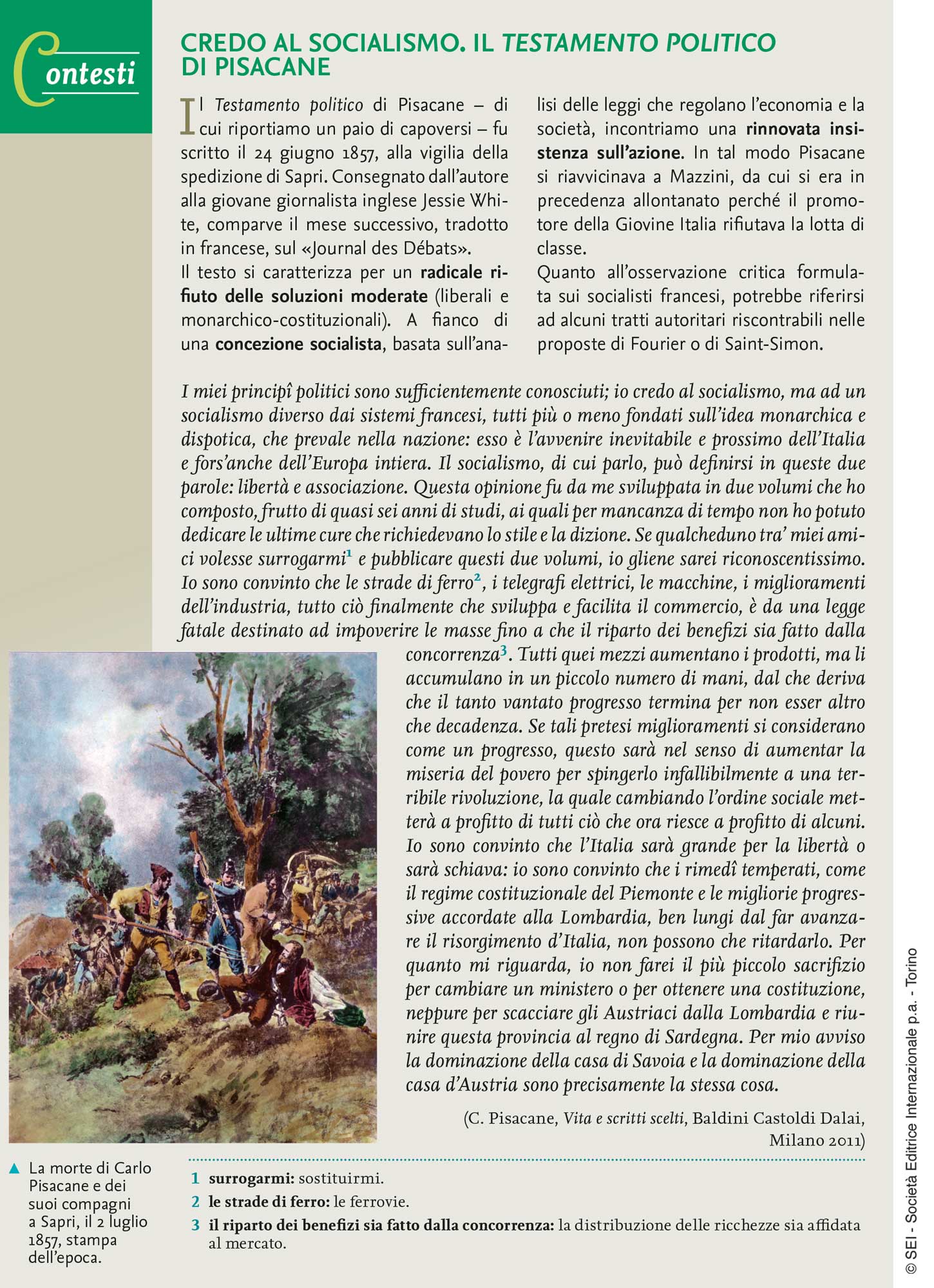 Distante dal cattolicesimo di Gioberti e dalla concezione metafisica e romantica della libertà di Mazzini, appare il pensiero del patriota napoletano Carlo Pisacane (1818-1857), persuaso che nessuna autentica libertà sia possibile senza una precedente eliminazione delle diseguaglianze sociali e della disparità economica. Per Pisacane le grandi masse popolari e contadine verranno coinvolte nel Risorgimento soltanto se si tratterà di una rivoluzione in grado di cambiare le condizioni materiali della loro esistenza: e ciò sarà fattibile specialmente nel Sud, dove è più debole quella classe borghese che ha provocato il fallimento della Rivoluzione francese.