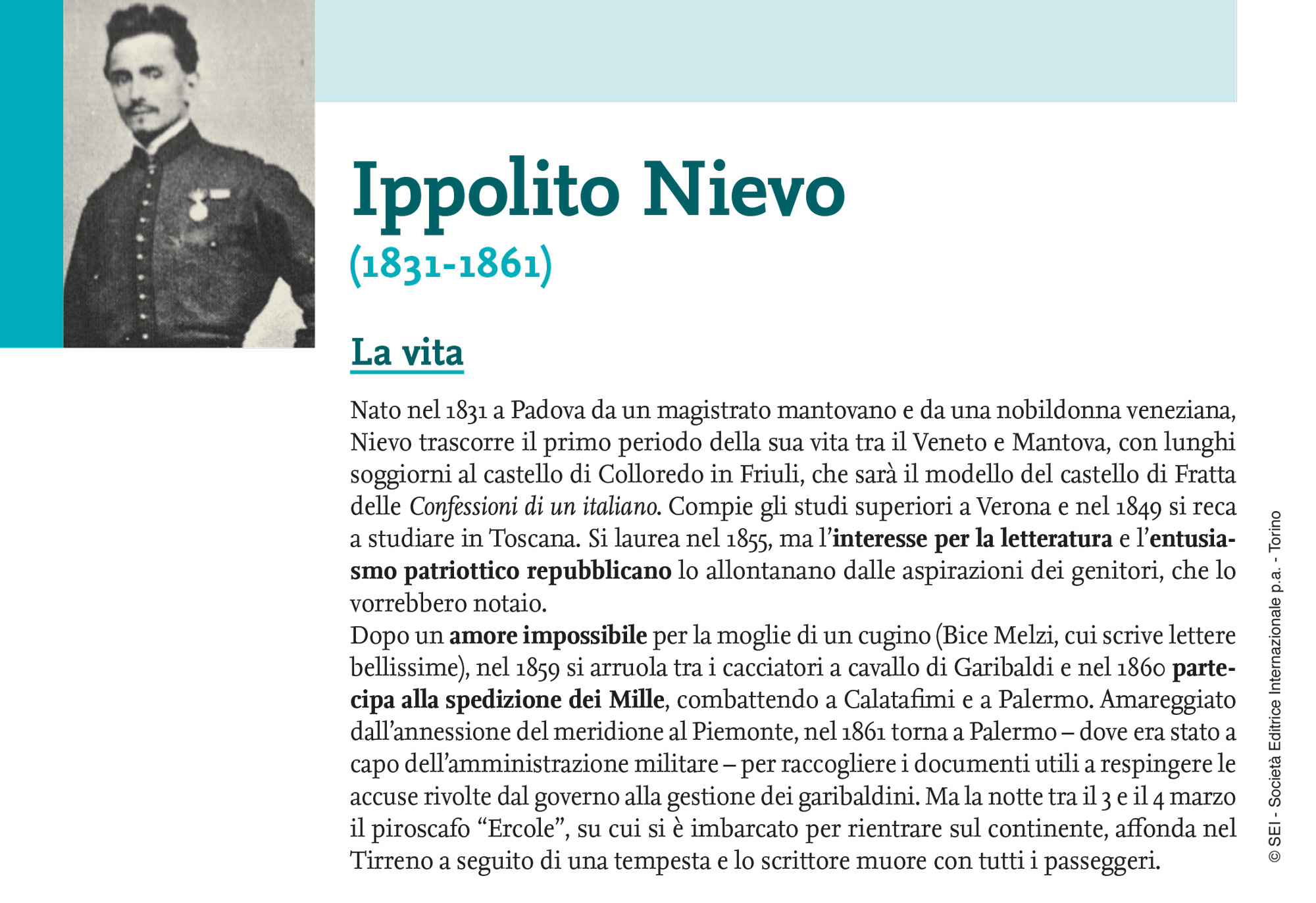 Assai varia, nonostante la brevità della vita (morì all’età di 29 anni), fu la produzione letteraria di Ippolito Nievo. Garibaldino educato alla scuola mazziniana, Nievo concepisce la letteratura come specchio della società e come strumento di educazione civile. A tal fine egli non utilizza la storia passata, ma rivolge l’attenzione a quella recente e contemporanea, mettendo in risalto le problematiche aperte a partire dalla questione nazionale e risorgimentale. Perciò la vicenda del suo capolavoro, le Confessioni di un italiano, arriva sino agli anni della sua composizione (1757-1758): il protagonista è un “ottuagenario” – nonno del narratore, nella finzione letteraria – che ripercorre la propria biografia a partire dagli ultimi decenni del Settecento; ma i suoi tempi finiscono per coincidere con quelli dello scrittore. Mentre il romanzo storico si impegnava ad attualizzare alcuni eventi dell’Italia medievale o rinascimentale, qui l’attualità occupa larga parte della scena; e innanzitutto in ciò consiste il passaggio al romanzo sociale e all’affresco di una moltitudine di personaggi: avvocati e dottori, cancellieri e cappellani, monsignori e contesse, sguatteri e fattori, cuoche e briganti, reazionari e patrioti, spie ed eruditi