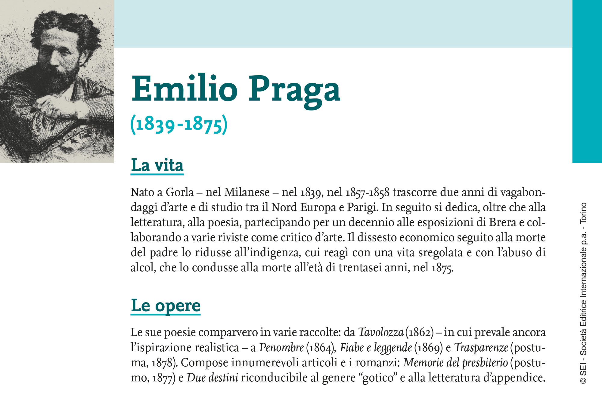 Emilio Praga, soggiornò a Parigi tra il 1857 e il 1858, mentre apparivano e venivano sottoposti a un processo I fiori del male di Baudelaire. L’influenza dello scrittore francese è evidente nelle raccolte di poesie di Praga, da Tavolozza del 1862 (che nel titolo richiama la sua passione per la pittura) a Penombre del 1864, dove il ribellismo sfocia nella sensualità, nella volontà di trasgressione e talora nella violenza del linguaggio.