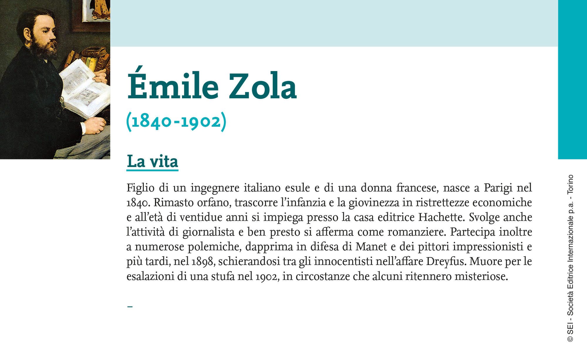 Zola raggiunge il successo letterario nel 1867 con la pubblicazione di Teresa Raquin, cui seguono altri venti romanzi raccolti nel ciclo dei Rougon-Macquart («storia naturale e sociale di una famiglia sotto il secondo impero»): tra i più celebri si ricordano Il ventre di Parigi, Nana, La bestia umana, L’ammazzatoio – ove il titolo si riferisce alla bettola frequentata dagli alcolisti – e Germinale, ambientato nelle miniere. Nel 1880 pubblica il saggio Il romanzo sperimentale, che lo consacra caposcuola del Naturalismo francese. La produzione narrativa degli ultimi anni prende di mira la superstizione religiosa (nella trilogia Tre città: Lourdes, Roma, Parigi) e celebra in toni didattici le potenzialità del progresso nel ciclo incompiuto dei Quattro vangeli.