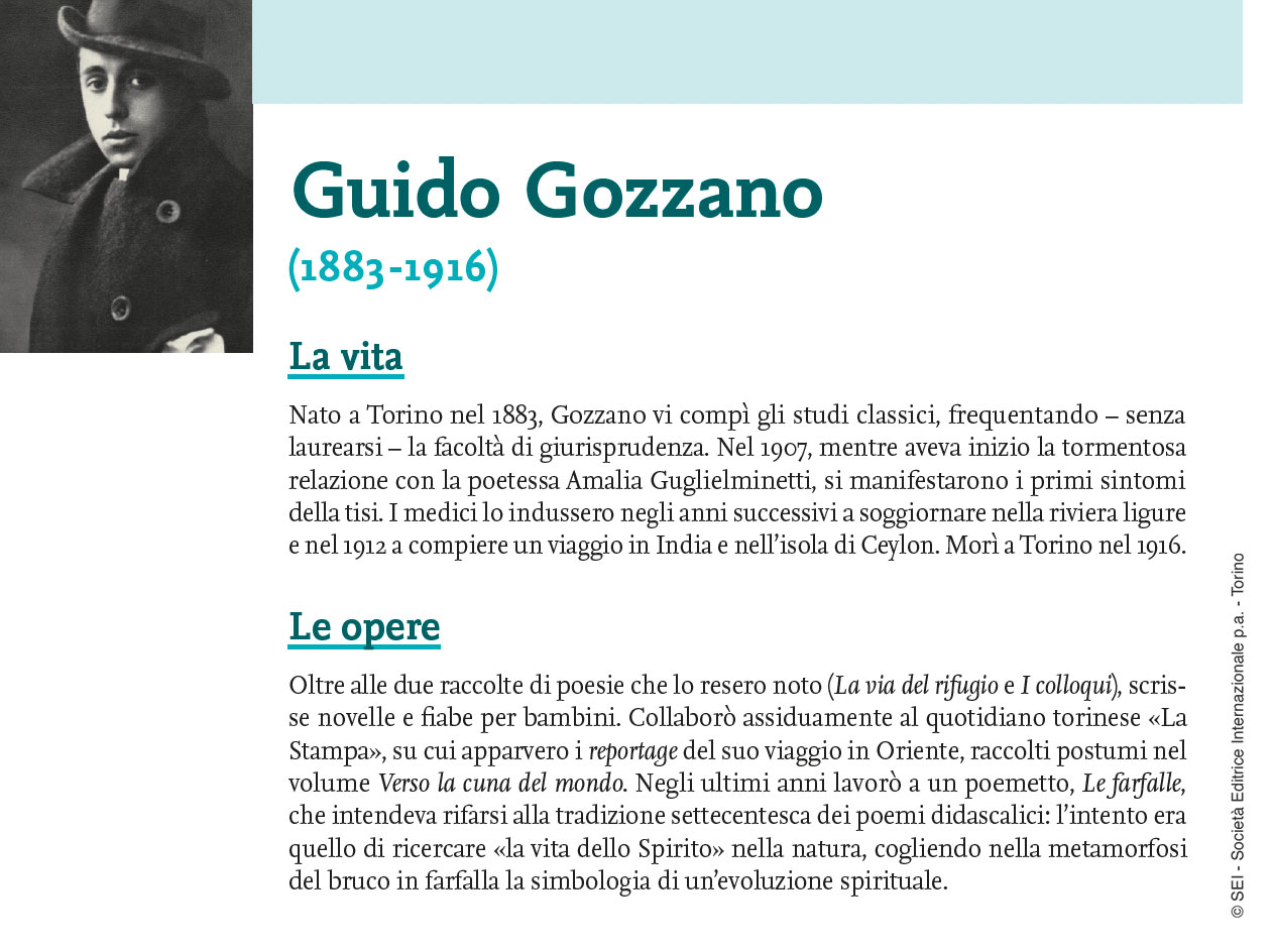 Pubblicati nel 1911, I colloqui sono il libro della maturità artistica di Gozzano. L’opera, di contenuto autobiografico, è formata da ventiquattro componimenti che scelgono uno stile volutamente prosaico. Notevole è la sperimentazione metrica e linguistica e l’abilità che l’autore dimostra nel mescolare lo stile alto e solenne della tradizione poetica italiana e il prosaico, che scaturisce dalla quotidianità dei temi trattati. Il ritmo del componimento riprende la cadenza tipica delle filastrocche (Gozzano fu anche autore apprezzato di fiabe) e i contenuti sono resi più leggeri dall’uso dell’ironia.
