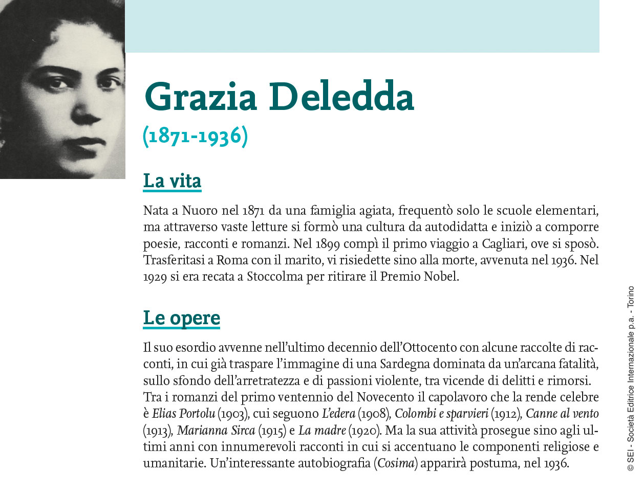 Per il carattere regionale delle sue opere Grazia Deledda si colloca sulla scia del Verismo, con tratti che tuttavia la inseriscono per molti versi nella letteratura del Decadentismo. La sua narrativa, ambientata nella natìa Sardegna, presenta forti vicende d’amore, di dolore e di morte, nel quadro di una società pastorale-patriarcale, di una cultura dominata dal senso del peccato – e della sua necessaria espiazione – e di una natura aspra e primitiva; ricorrente è la lotta tra la ribellione individuale e la sottomissione alle tradizioni. In Deledda le ricerche musicali e coloristiche producono pagine di un intenso lirismo, che come osservato da Sapegno «tende di fatto al simbolo o per meglio dire alla parabola con la sua forza di convinzione suggestiva ma elementare».