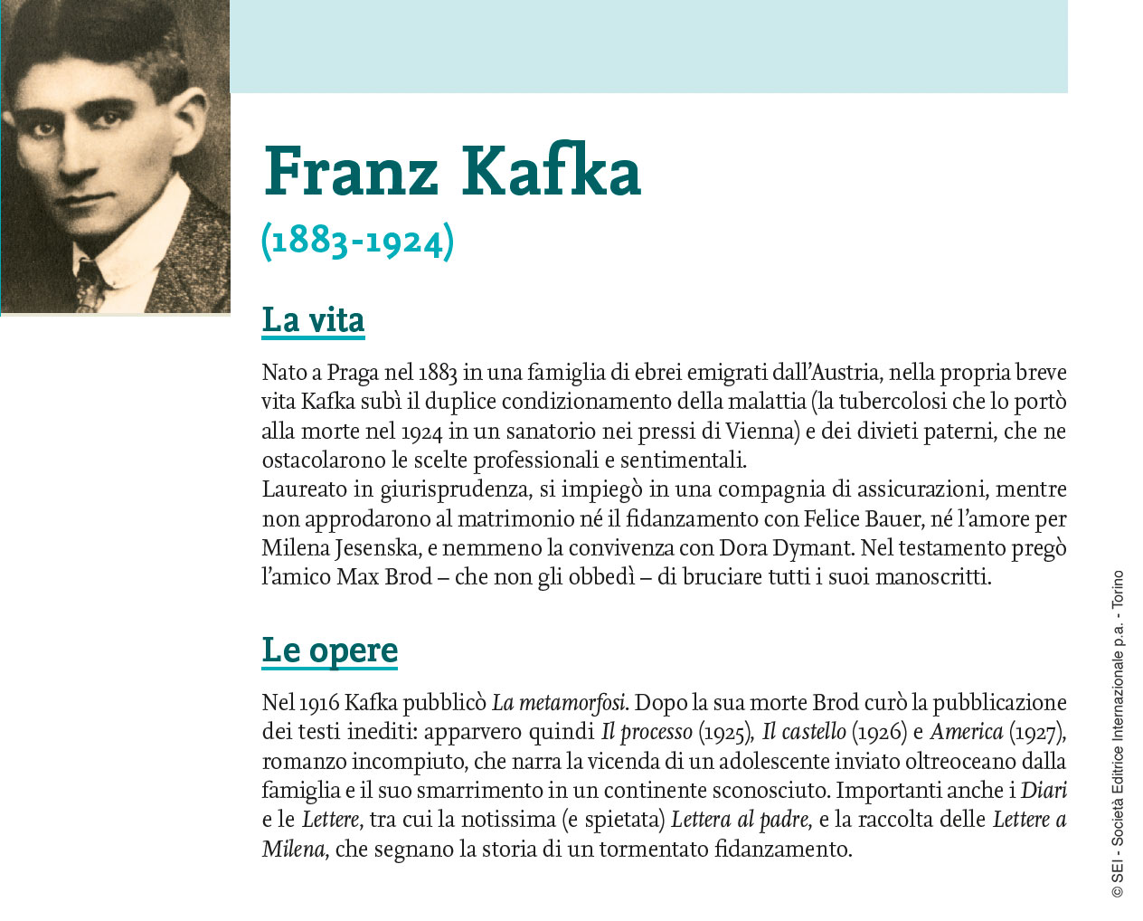 «Io ho potentemente assunto il negativo del mio tempo», scrive Franz Kafka nei Diari pubblicati postumi nel 1951: e in effetti le dimensioni dell’angoscia e dell’assurdo, dell’incubo e del grottesco, sono ricorrenti nella sua narrativa, a partire dal noto racconto La metamorfosi (del 1916).