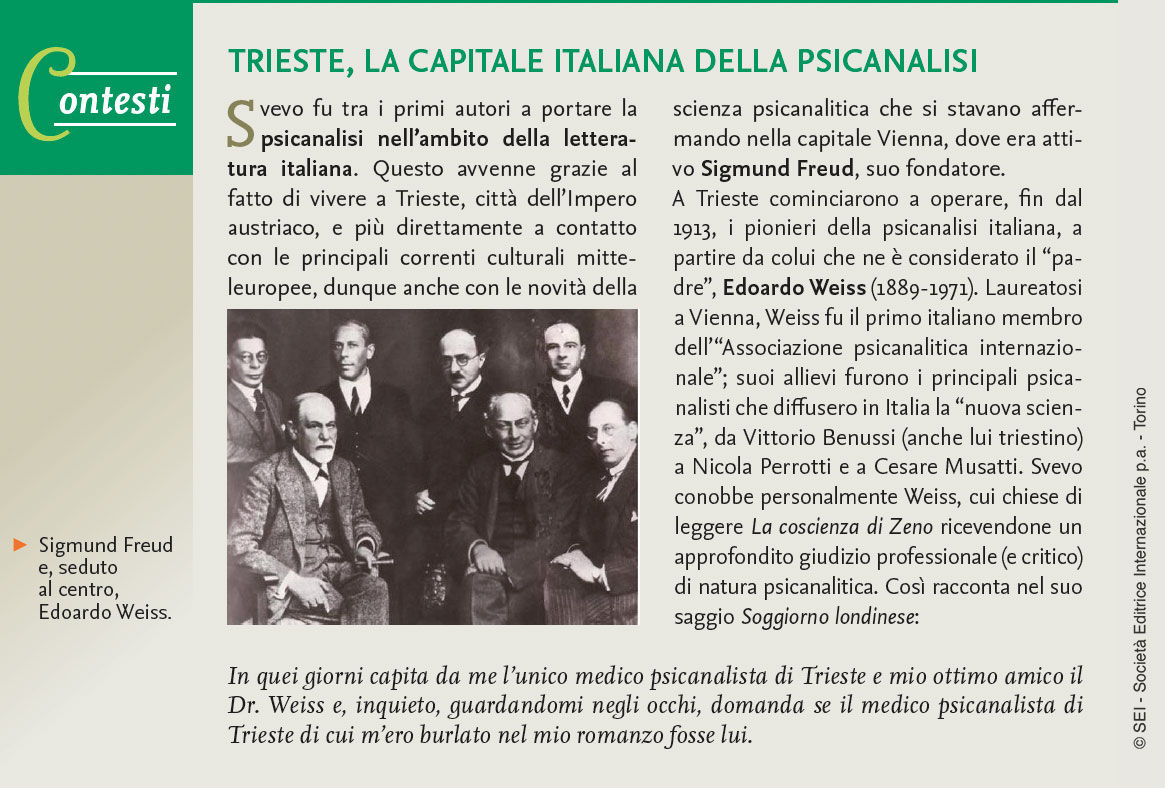 Il protagonista del romanzo, e voce narrante, è un maturo commerciante triestino, Zeno Cosini. Afflitto da disturbi nervosi, scrive su consiglio del suo psicanalista la propria autobiografia, nel tentativo di individuare le cause del suo malessere. Il manoscritto illustra così i momenti fondamentali della vita di Zeno: la dipendenza dal fumo, il rapporto con il padre e la sua morte, il percorso che l’ha condotto al matrimonio, le vicende extraconiugali e professionali, le stesse cure psicanalitiche. Il romanzo si conclude con lo scoppio della Prima guerra mondiale e la decisione di abbandonare la psicanalisi.