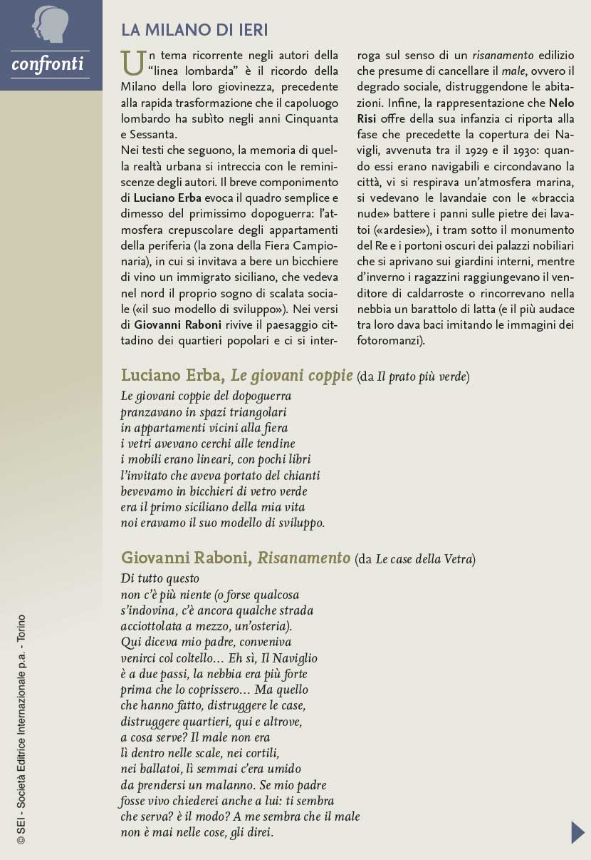 Luciano Erba (1922-2010), tornato a Milano dopo aver trascorso molti anni all’estero, si caratterizza per una poesia prevalentemente memoriale, soffusa di un’ironia che non esclude la partecipazione emotiva. Il linguaggio è antiletterario e tende a ritrarre in rapidi scorci – e con apparente indifferenza – immagini e atmosfere di un passato guardato con attenzione al tratto emblematico e all’aneddoto.