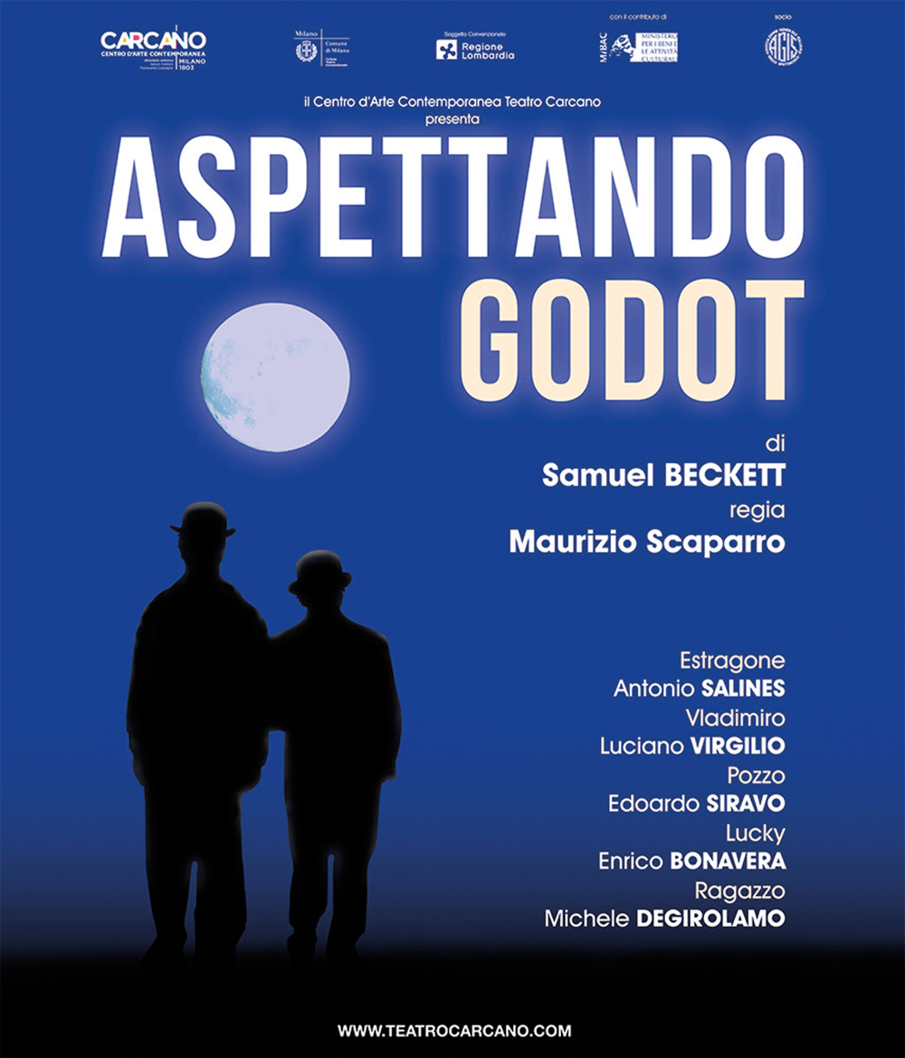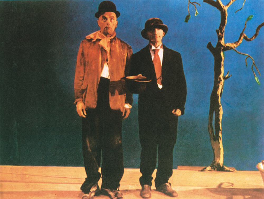 In una strada deserta di campagna, due barboni – Vladimiro ed Estragone – attendono accanto a un albero un misterioso personaggio di nome Godot. Nel frattempo, per ingannare la fame, si intrattengono con discorsi sconclusionati, chiamandosi Didi e Gogo. Poi compare Pozzo, un ricco proprietario che tiene al guinzaglio Lucky, il quale a dispetto del nome è tutt’altro che fortunato, perché deve trascinare un pesante carico di bagagli e sta per essere venduto come schiavo. Nel secondo atto la scena è simile: siamo nel giorno successivo, i due protagonisti ripetono dialoghi analoghi e progettano un ipotetico suicidio. Ricompaiono Pozzo e Lucky: adesso il primo è cieco e domanda incessantemente che ora è, ma non ottiene risposta perché il secondo è muto. Come al termine del primo atto, un ragazzo annuncia che Godot non verrà neanche stasera, lasciando depressi i due vagabondi.