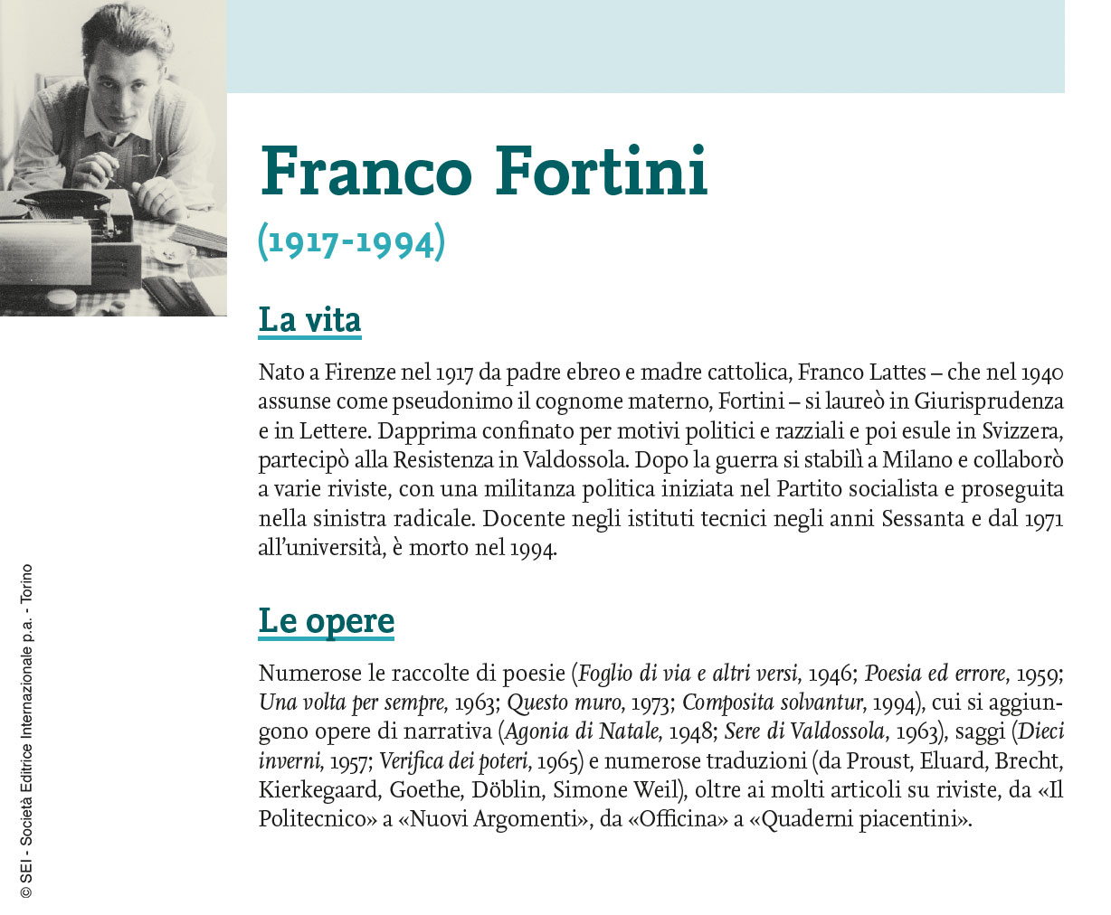 Nato a Firenze ma residente dal dopoguerra a Milano, Franco Fortini è anche un importante critico, saggista e traduttore (specialmente di Brecht e di Goethe). Nella sua prima raccolta di poesie, Foglio di via del 1946, prende le distanze sia dall’Ermetismo – guardato come un’evasione dalla storia nel disimpegno solitario della metafisica – sia dalle aspettative ingenue e consolatorie del Neorealismo: prevalgono invece una risentita coscienza etica, una sostanziale sfiducia nella letteratura (incapace di produrre “verità”) e una visione tragica della storia contemporanea, soggetta allo strapotere dell’economia neocapitalistica.