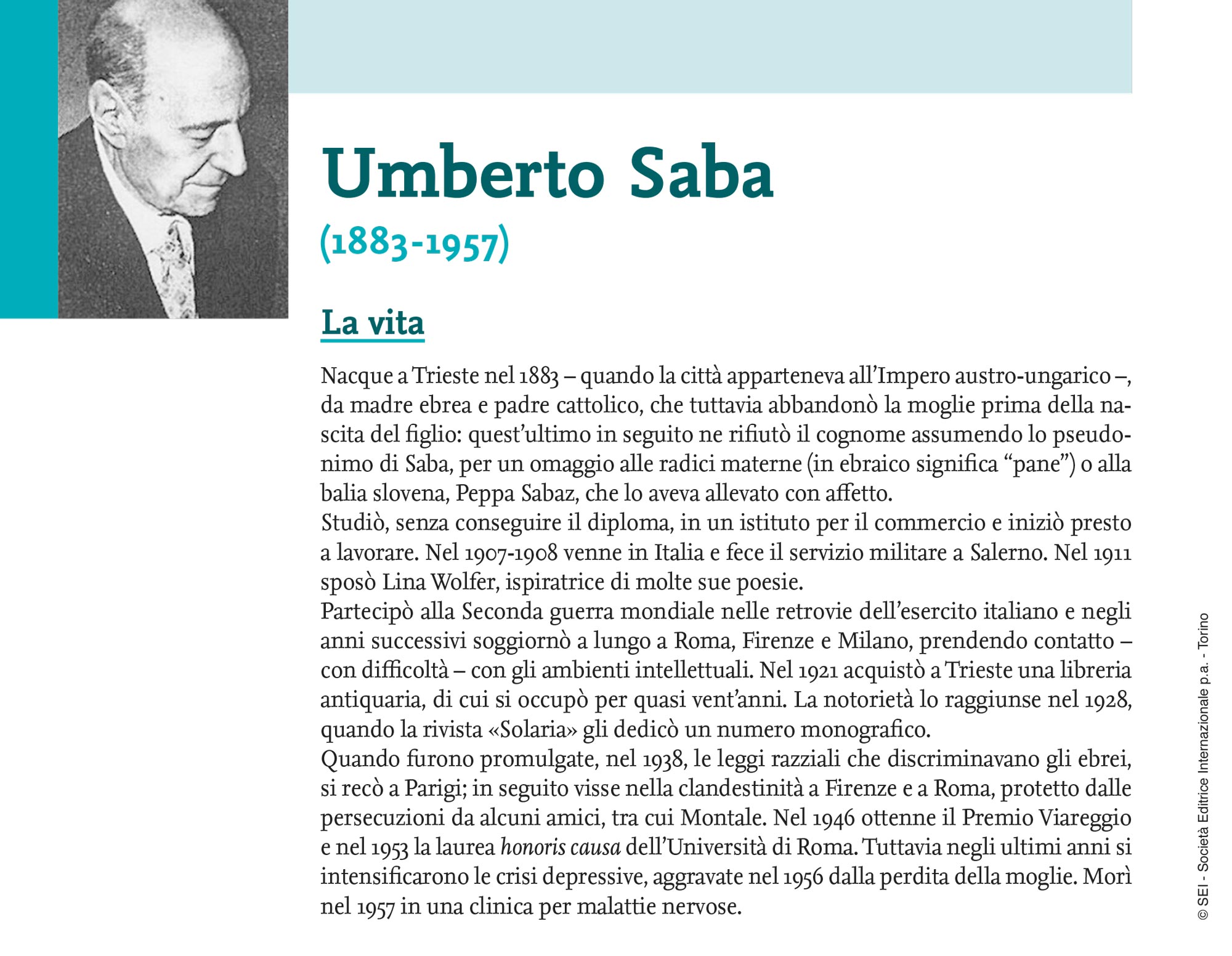 La produzione poetica di Saba è raccolta nel Canzoniere, di cui uscirono cinque edizioni (nel 1921, nel 1945, nel 1948, nel 1951 e l’ultima, postuma, nel 1961). Ma l’opera si venne componendo attraverso le successive addizioni delle diverse sezioni, a partire dalle iniziali Poesie dell’adolescenza dei primissimi anni del secolo. Seguono, tra le più significative, le Poesie fiorentine (composte in un soggiorno a Firenze nel 1905-1906), i Versi militari (scritti nel 1907-1908, durante il servizio militare), Città e campagna (su una villeggiatura trascorsa in serenità con la famiglia sui colli presso Trieste), Trieste e una donna (sulla crisi coniugale e sulla tormentata riconciliazione), La serena disperazione del 1913-1915 (una riflessione sul proprio passato), le Poesie scritte durante la guerra, Cose leggere e vaganti e L’amorosa spina del 1920 (poesie dedicate alla figlia o ispirate dall’amore per la commessa Chiaretta), Autobiografia e I prigioni del 1924 (due raccolte che contengono ciascuna quindici sonetti, che nella seconda presentano diversi caratteri umani: Il lussurioso, Il violento, L’accidioso...), Fanciulle del 1925 (dodici ritratti di ragazze), Cuor morituro del 1925-1930, Il piccolo Berto (sull’infanzia riscoperta alla luce della psicoanalisi), Parole del 1933-1934 e Ultime cose (in cui ci si avvicina alla poetica dell’Ermetismo), Mediterranee del 1947 e infine Sei poesie della vecchiaia.