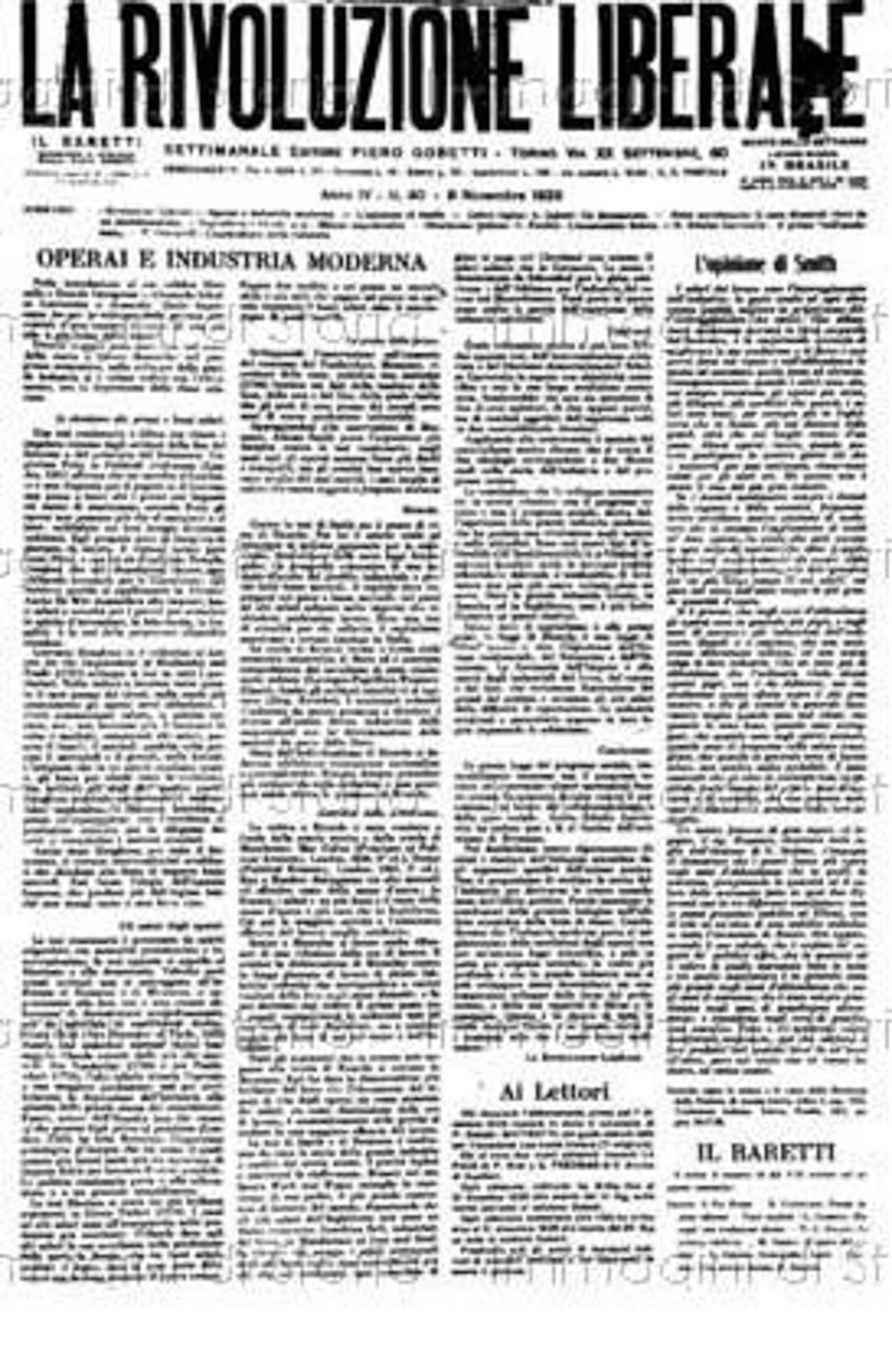 Nel 1918, quando è ancora studente liceale, fonda la rivista «Energie nuove», lanciandosi in un’intensa attività giornalistica ed editoriale che proseguirà nel 1922 con «La Rivoluzione liberale», in cui elabora un progetto politico che dovrà incentrarsi sulla partecipazione attiva della classe operaia. Auspica anche la nascita di una nuova classe dirigente moderna e progressista ed è convinto di una possibile ripresa rivoluzionaria della borghesia liberale: di qui il suo interesse per l’Illuminismo, lo studio e la stesura del saggio sulla Filosofia politica di Vittorio Alfieri e la scelta di intitolare la sua ultima rivista «Il Baretti», dal nome di un letterato piemontese del Settecento che era stato esule in Inghilterra.