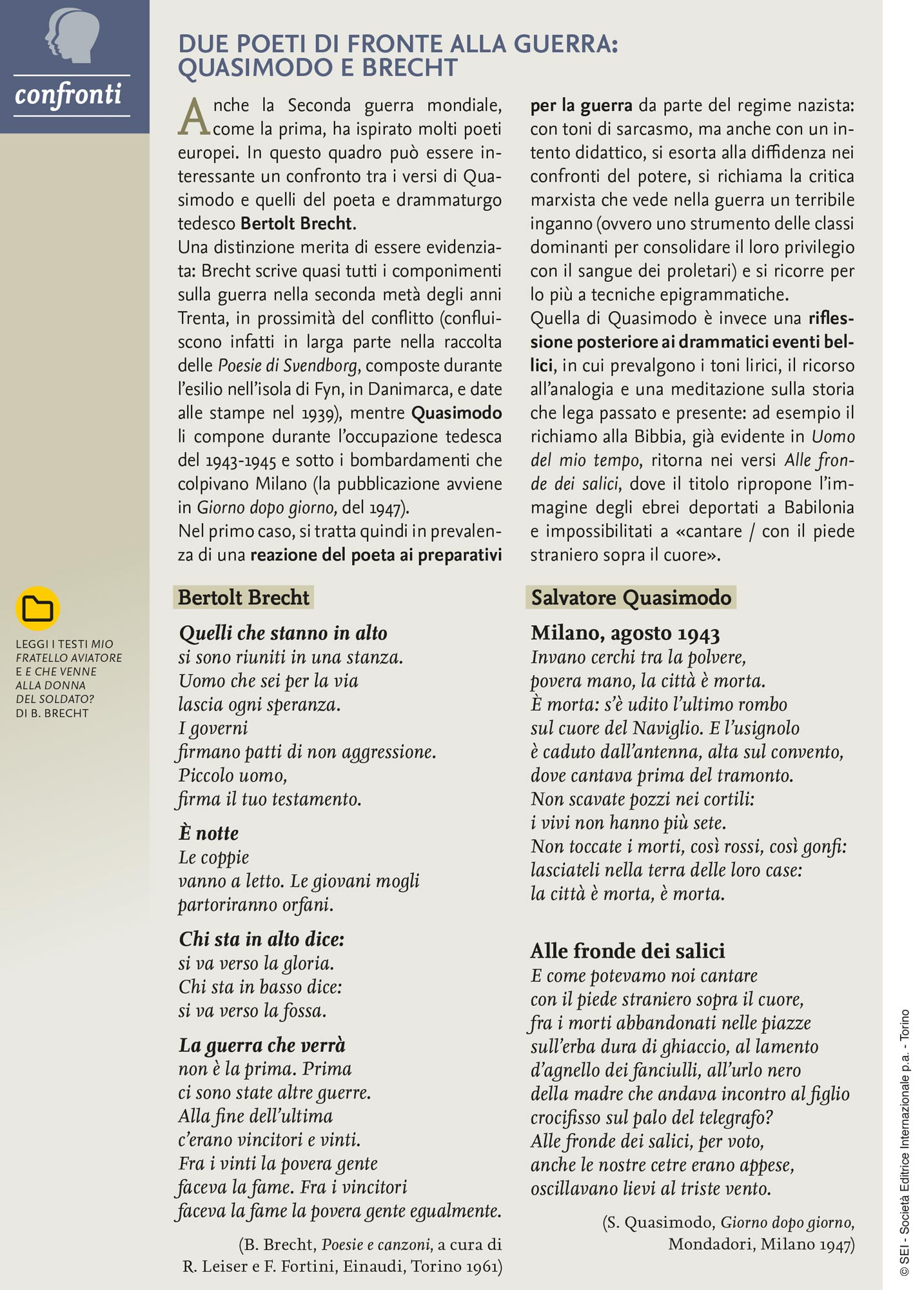 Già nelle sue prime opere teatrali, che si avvalgono delle musiche originali di Kurt Weill, Brecht mostra tutta la sua originalità. L’opera da tre soldi (1928), nata dal rifacimento in chiave grottesca di un’opera inglese del Settecento, è ambientata nella malavita londinese e in un universo “borghese” di delinquenti e miserabili, in cui anche la “carità” diventa un’industria finalizzata al profitto (protagonista è un boss dei mendicanti). Le opere successive (L’ascesa e caduta della città di Mahagonny, del 1928-1929, Santa Giovanna dei macelli, del 1929-1930, e Madre Courage e i suoi figli, del 1939) pongono al centro una riflessione sul potere del denaro e sui rapporti tra le classi sociali. Nell’Anima buona di Sezuan (1938-1940), invece, Brecht propone il tema della rivoluzione. Infine, Vita di Galilei, proposta in tre versioni (1938-1939; 1945-1946; 1953-1955), indaga la figura dello scienziato, che viene vista sotto diverse angolazioni e sviluppa una riflessione sulla scienza. Oltre all’opera teatrale, sono importanti le poesie (specialmente le Poesie di Svendborg del 1939) e i saggi postumi (Scritti teatrali e Diario di lavoro); interessante anche il romanzo incompiuto Gli affari del signor Giulio Cesare.
