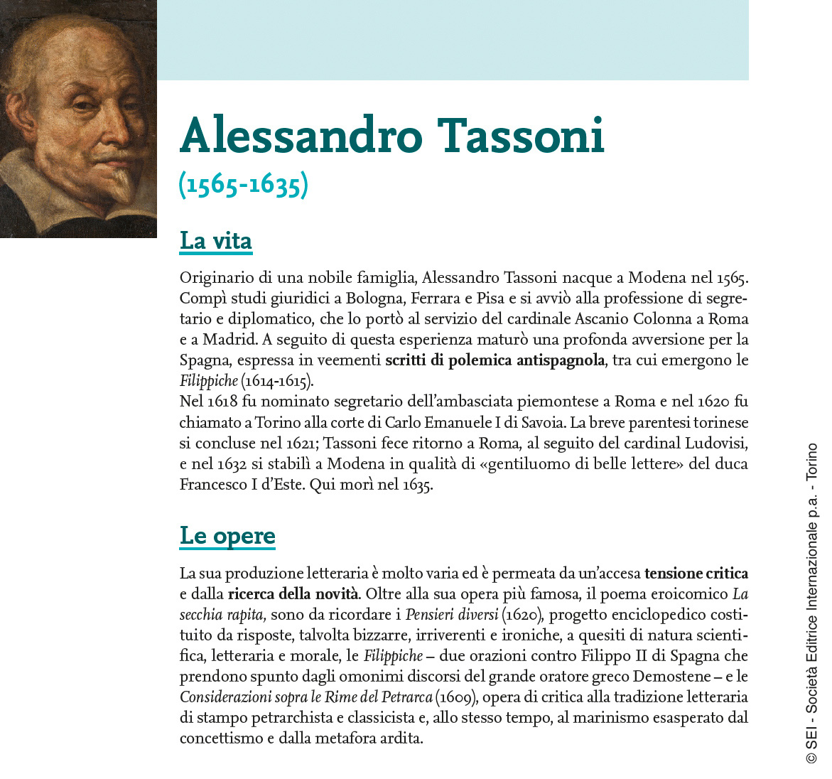 La prima edizione è pubblicata a Parigi nel 1622; poi l’opera è inserita tra i libri proibiti, viene rivista dall’autore e infine pubblicata a Venezia nel 1630. Tassoni segue gli schemi del poema epico ma ambienta le vicende nel periodo delle lotte comunali tra Modena e Bologna: le due città si contendono una secchia di legno rubata dai modenesi ghibellini (sostenuti dall’imperatore Federico II di Svevia) ai bolognesi guelfi (sostenuti dal papa). Come nella Gerusalemme liberata forze celesti intervengono nella storia: in questo caso si tratta di divinità dell’Olimpo che si dividono nella protezione alle due città. Dopo varie e alterne vicende l’opera si conclude con la vittoria di Modena. Nella dedica del poema ad Antonio Barberini, Tassoni presenta subito l’elemento di novità del poema, cioè l’unione della dimensione eroica e dell’elemento comico, che di fatto ribalta le caratteristiche del genere epico perché mette in ridicolo i principali elementi su cui si basa: basti pensare che nei ritratti delle divinità olimpiche che parteggiano per le due città Tassoni inserisce caricature dei personaggi della curia papale del suo tempo, e che l’oggetto della contesa dei valorosi eroi è il secchio di legno di un pozzo (dunque di nessun valore), che i modenesi rubano dopo aver bevuto. Nuova è anche l’introduzione della figura dell’antieroe, il Conte di Culagna, che l’autore presenta secondo gli schemi della descrizione dell’eroe, ma che manifesta caratteristiche opposte: è filosofo, poeta e bacchettone (cioè mostra una grande religiosità che non corrisponde a ciò che sente).