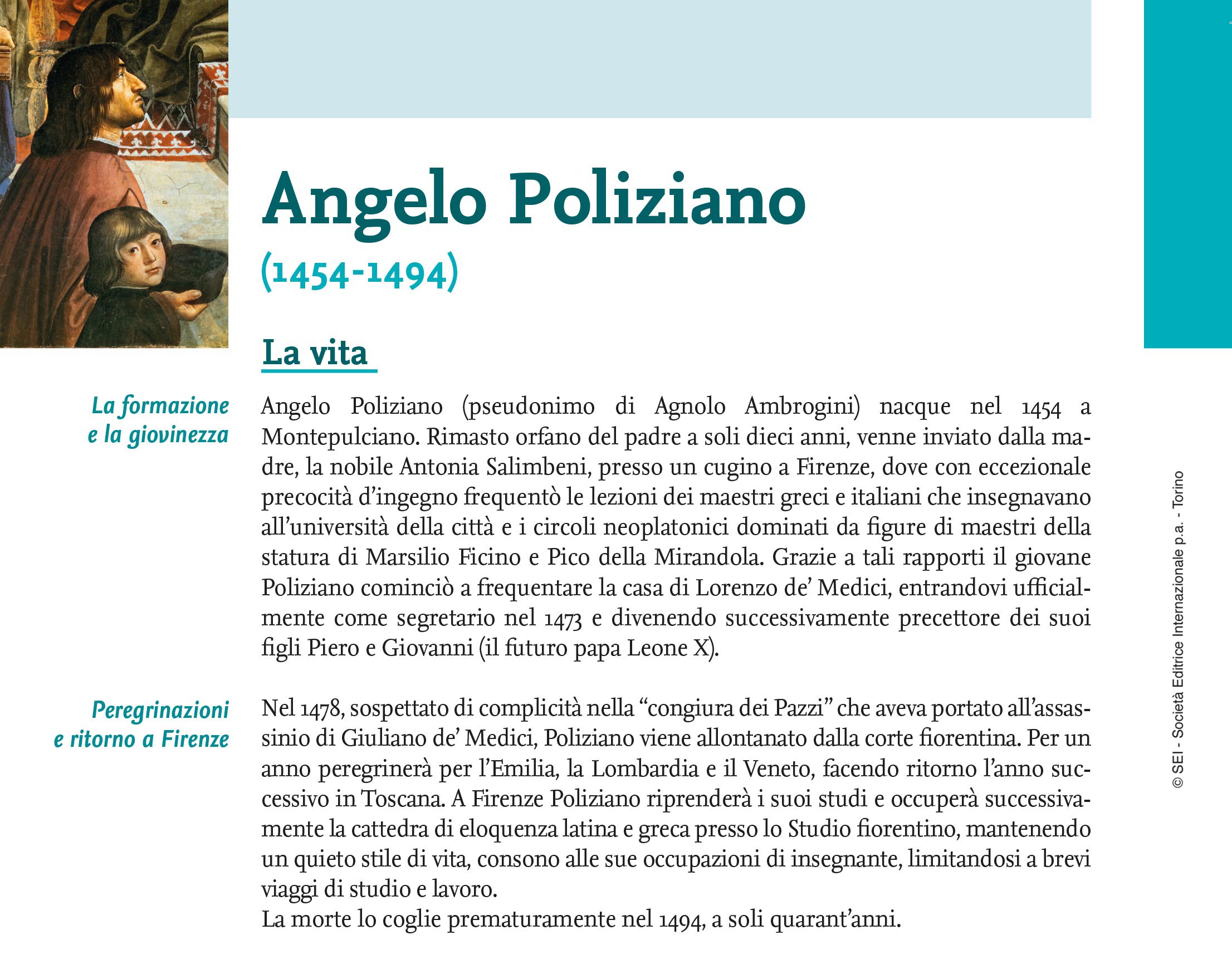 Le opere latine - L’opera latina rappresenta un intreccio di umanesimo “civile” e di appartata clausura. Poliziano si dedica a questioni filologiche, approfondisce argomenti di storia letteraria, si dedica all’analisi di problemi diplomatici e politici. A questa produzione in prosa si affiancano le liriche latine, che trattano i temi consueti della contemporanea lirica umanistica: evocazioni amorose, elogi di potenti e amici, epicedi (componimenti di lode funebre), invettive.